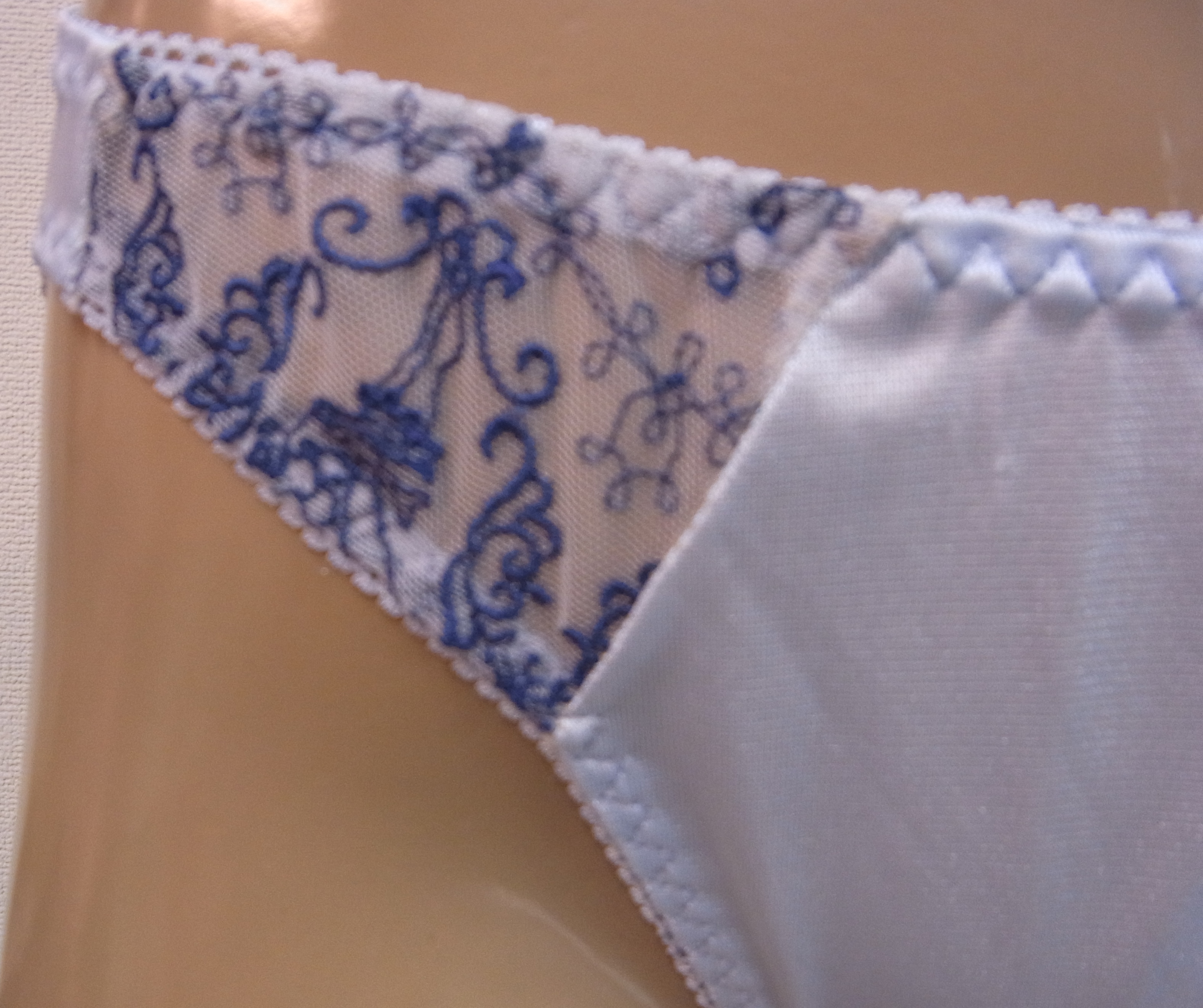 色:水色、レース白花柄。フロント刺繍。クロッチ当て布あり。