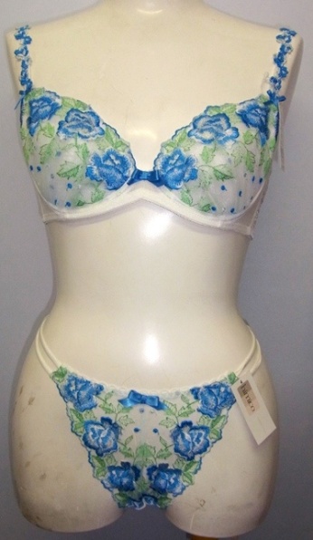 色:白、青と緑の花刺繍柄。 パット式。 ストラップ着脱不可。調整可能。 両脇二本取りの紐タイプ(結びではありません)。