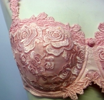 柔らかい素材。色ピンク。 フルカップブラジャー&ノーマルバックショーツセット。 ストラップ着脱不可。調整可能。 着脱可能パット付。 ショーツフロントは花柄レース。